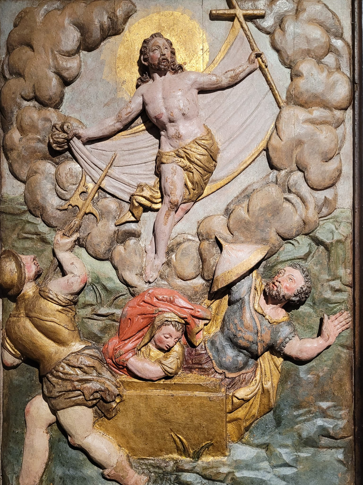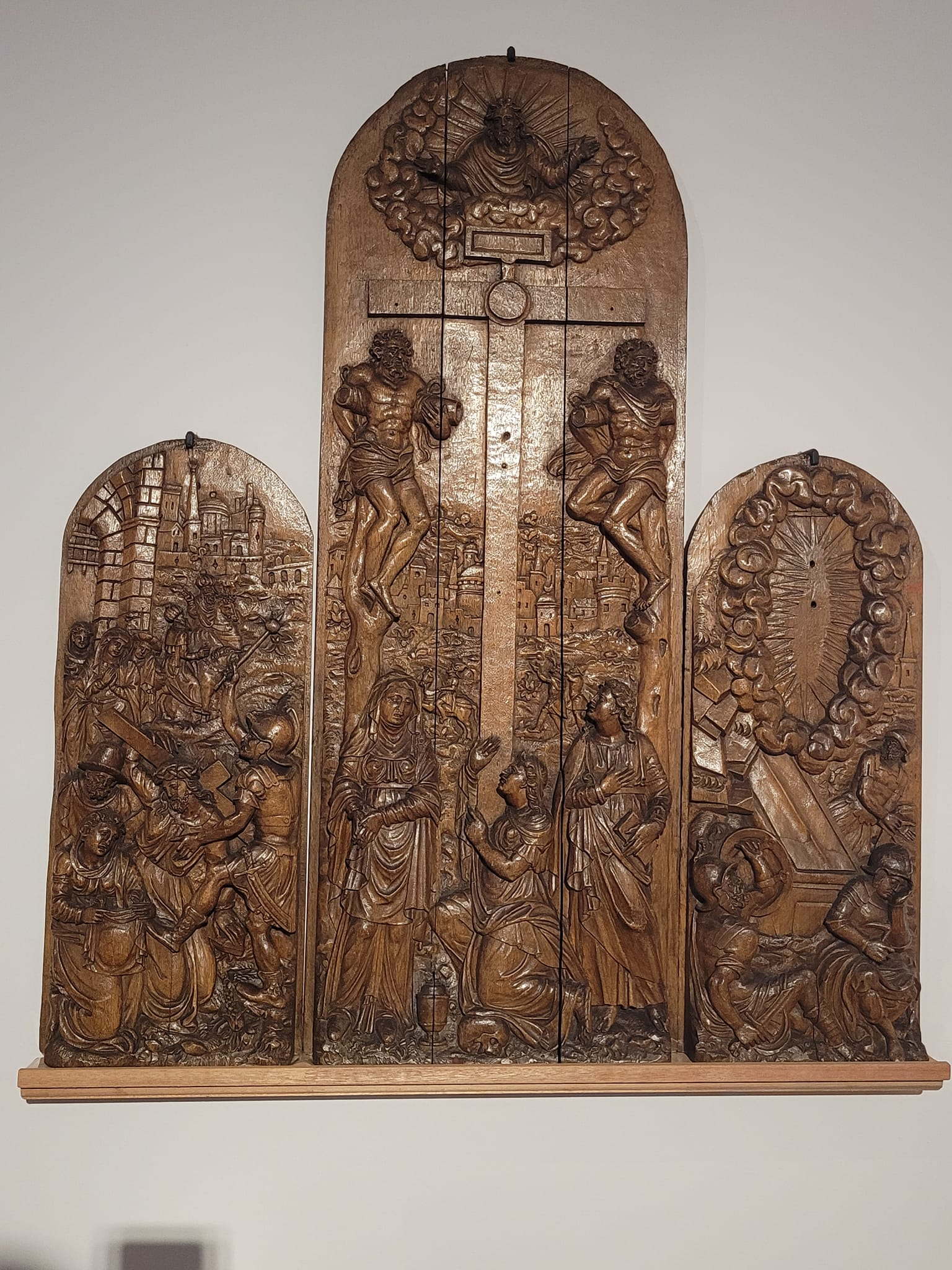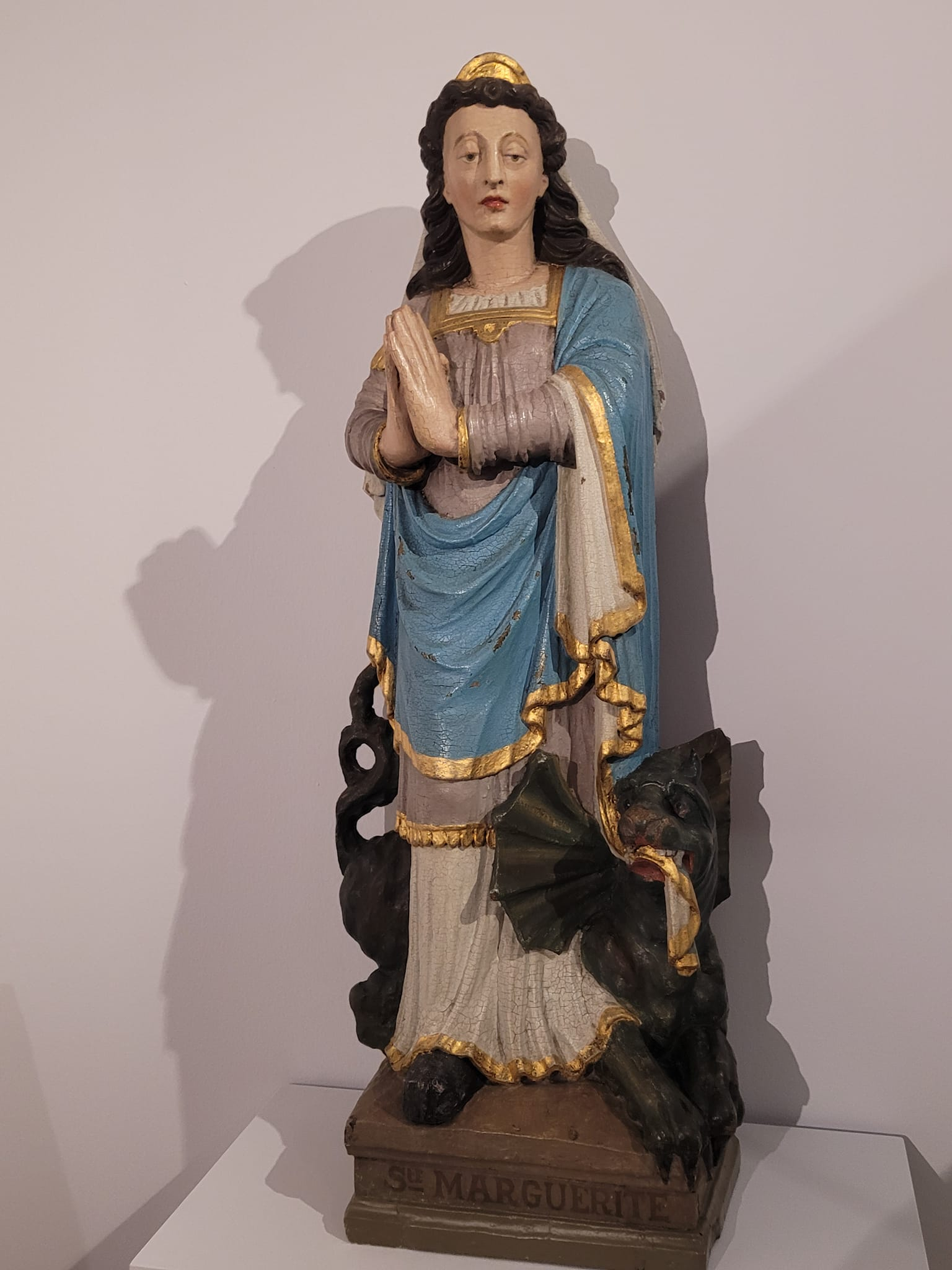 Accueillis au premier étage par une sculpture en bois de chêne de Sainte-Margueritte, celle-ci nous révèle les caractéristiques du maniérisme, les personnages sculptés étant étirés, possédant des hanches anguleuses, de longs cous sinueux et des doigts fuselés.