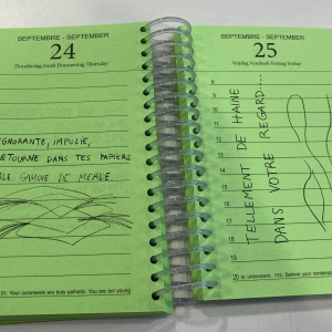 Pour assimiler et présenter ces messages, Sandrine Morgante a choisi cet objet ordinaire qu’est un bête agenda, pour évoquer la banalité de la violence verbale envers les femmes. Dispersés, au fils des jours, les propos moralisateurs, moqueries et violentes agressions nous sautent à la vue. Ils rappellent que la vie d’une femme est semée d’embûches écrites à l’avance. « Il n’empêche, il reste des espaces libres où l’on peut riposter et réécrire notre condition« , écrit-elle.
