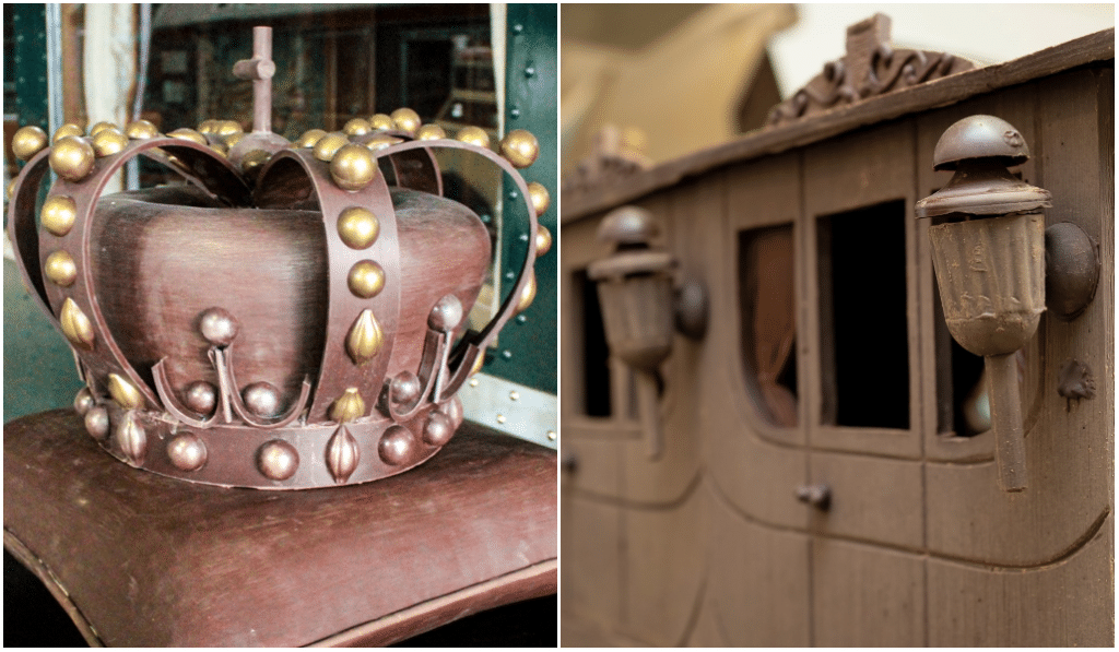 Ces dernières, autrefois, décoraient l’une des voitures d’un « TEE » (« Trans Europe Express »), exposée plus loin, face à de somptueuses voitures de deux trains royaux, ces différents trains ayant inspiré, également, nos deux sculpteurs chocolatiers.
