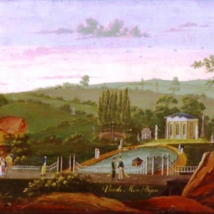 Sur la partie gauche de la vue, s’élève la façade ocre du moulin à farine de style Louis XVI que Cavens fit construire en même temps que la création du parc. On aperçoit la chute d’eau de la roue à aubes. En 1826, Cavens fit élever au sommet du parc une tour carrée qui servit d’habitation au jardinier. Comme elle n’est pas représentée ici, nous pouvons conclure que la boîte a été réalisée entre 1817, date d’achèvement du parc, et 1826.
