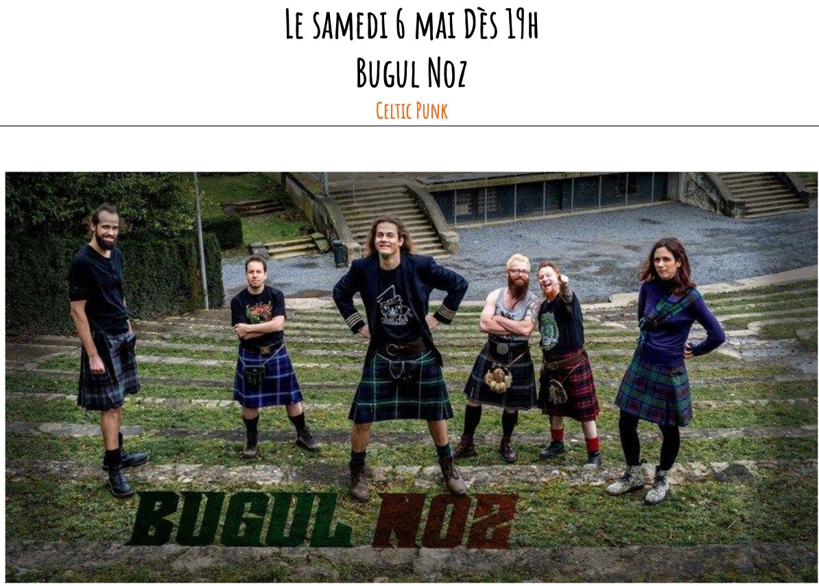 Bugul Noz est un groupe belge s’inspirant des sonorités venant de la musique punk et de la musique celtique, qu’elle soit irlandaise, bretonne ou écossaise tout en gardant une "patte" propre aux influences des différents membres! Groupe de scène, Bugul Noz met un point d'honneur à faire passer un moment de fête au public! Et puisqu’on parle de fête, nous allumerons le feu pour un « pain saucisse » convivial, dès 19h !