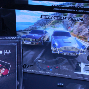 Le circuit (vendu à 70 € sur Amazon, à 75 € chez Slot Car Union contre 83 € à l'expo) alimenté par piles A4, comporte 9 tracés de piste. Il est dédié aux enfants dès l'âge de 5 ans et comprend des manettes adaptées aux petites mains, il peut également faire l'objet de compléments (loop, tracé complémentaire, ...). Deux voitures pour circuits Skalextric à l'échelle 1/32 sont également disponibles : la fameuse Lotus Esprit S1 et l'Aston Martin V8 (pour ces deux voitures, les prix sont conformes au prix du marché).