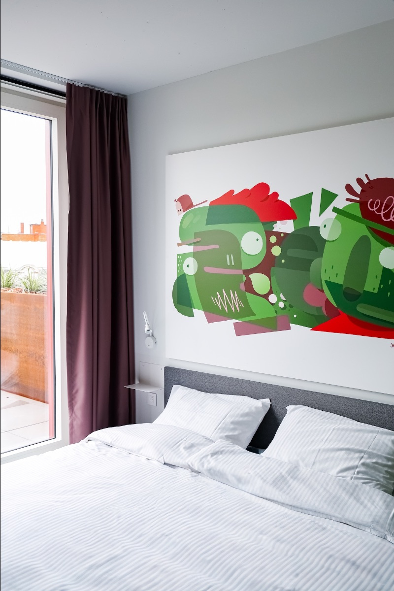 Chaque étage et chaque chambre racontent une histoire, entre couleurs, fresques murales, signalétique originale et éléments graphiques inspirés de la culture belge et bruxelloise. Une approche qui donne naissance à un hostel moderne et inspirant, ancré dans son époque.