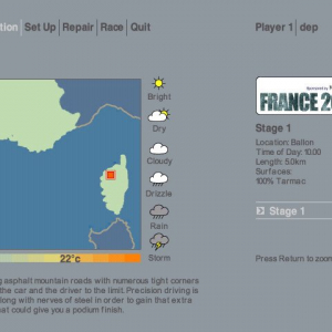- Un petit côté réaliste, certes partagé par d'autres jeux. Ainsi, voici un petit conseil pour la route (tant en mode championnat qu'en mode rallye unique) : bien lire les informations car le temps est variable, ceci afin de vous permettre de changer les pneus en conséquence, les réparations toutes les deux étapes sont vitales (à vous de bien gérer les priorités).