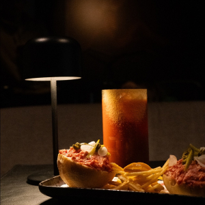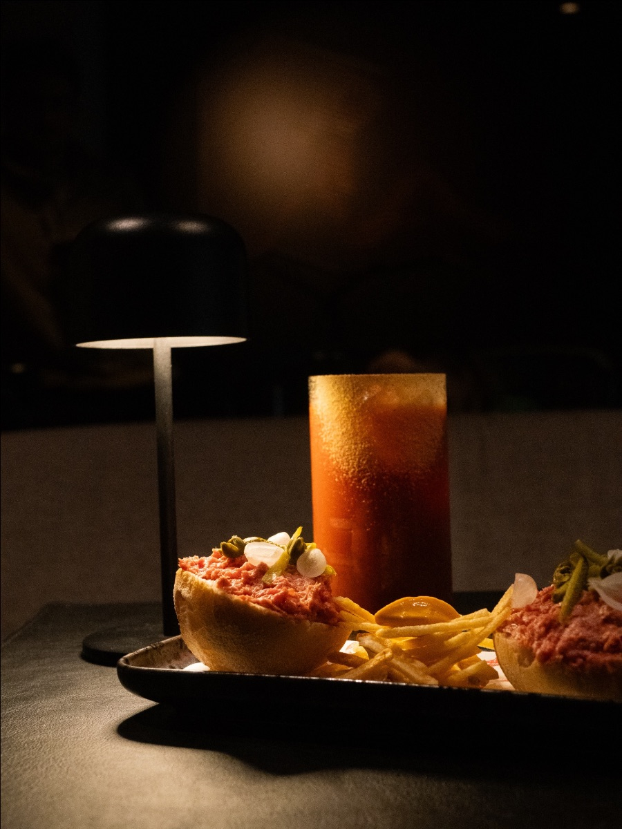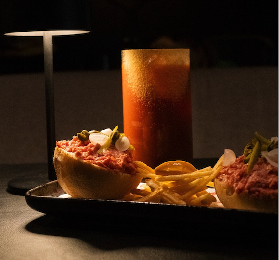 Un mini Pistolet Cannibale by Pistolet Original à déguster avec un Bloody Marie by "Confessions"revisité avec de l'ail noir, de la sauce ponzu et de la moutarde japonaise, sublimé par un jus de tomate marmande bio et quelques gouttes de tabasco. Le coté épicé de ce cocktail matche parfaitement avec cette version du pistolet ! L’américain est préparé chaque jour selon la recette exclusive de Pistolet Original. Le mini pistolet est toasté au moment même, présenté et accompagné de petites frites chips avec une sauce américaine maison.