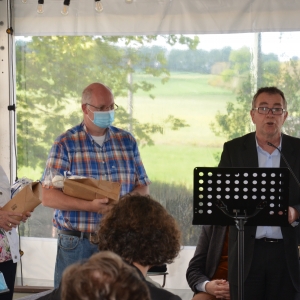 Une activité culturelle extérieure comme cette expo devient très vite ( malgré les circonstances actuelles ) une attraction touristique. Et donc pour répondre à la future demande des visiteurs, la maison du tourisme du Pays de Bastogne , par l’ entremise de sa directrice, a crée un folder,un plan, une brochure admirable, d’ ailleurs pour info et pour ceux qui le souhaite en guise de souvenir, il nous en reste quelques exemplaires à votre disposition, une brochure donc, permettant à chaque visiteur de choisir et de profiter au mieux de son parcours découverte. Merci à toi Justine , qui comme vous le voyez cumule plusieurs fonctions, merci donc Justine pour cette magnifique réalisation et nous te remettons également un petit présent.