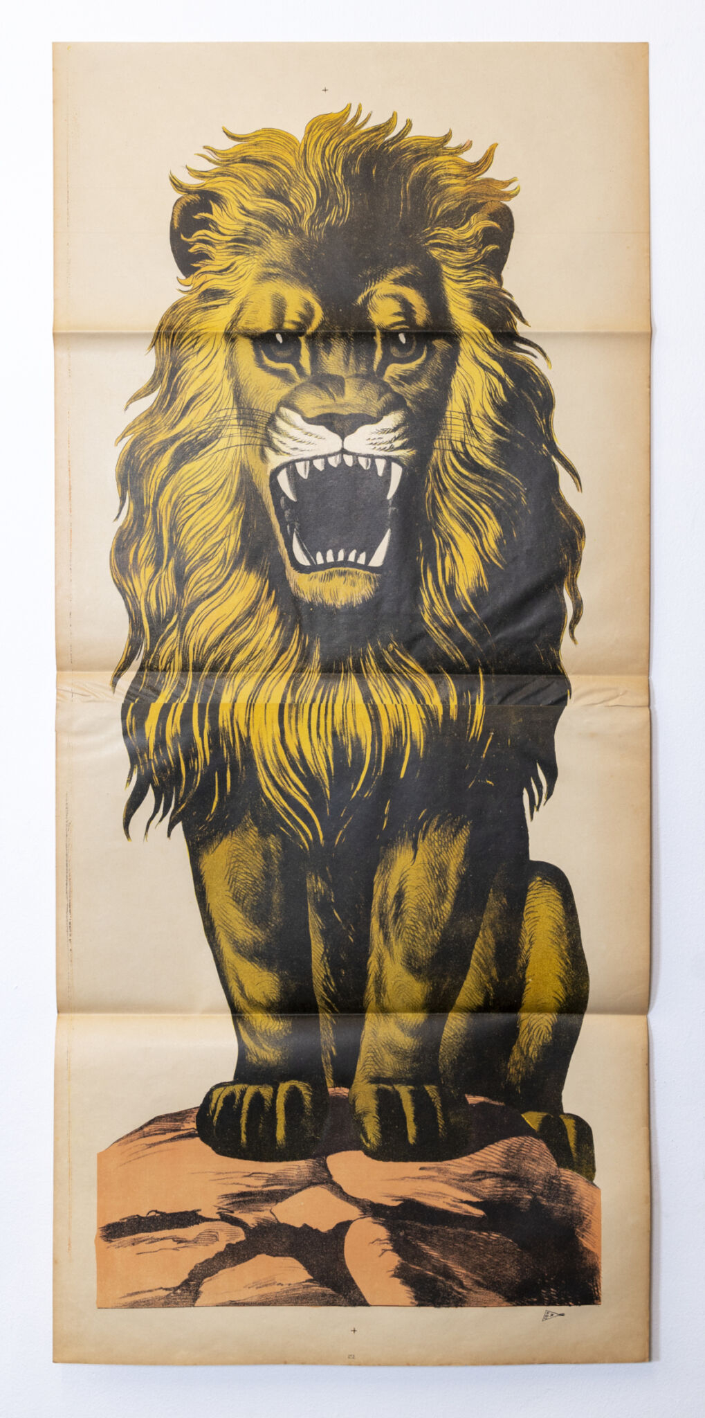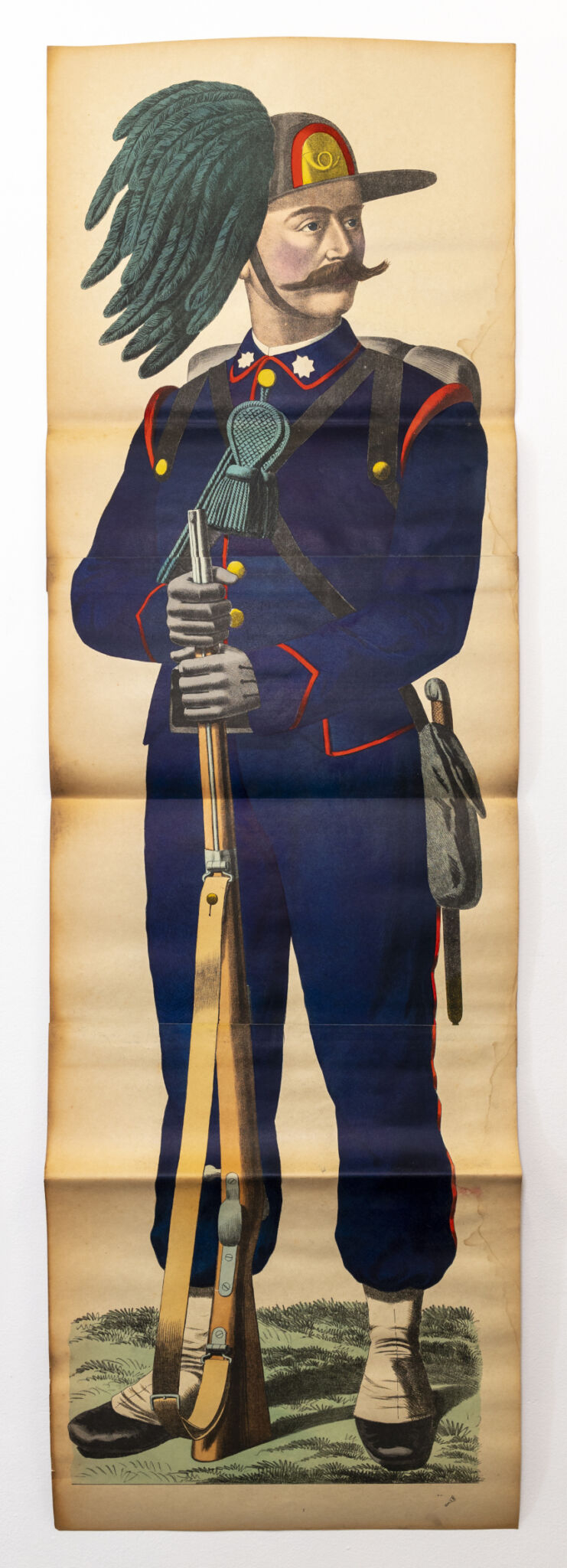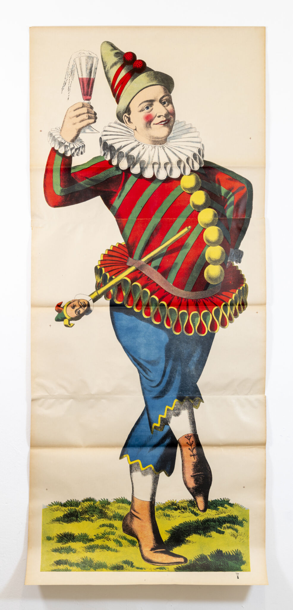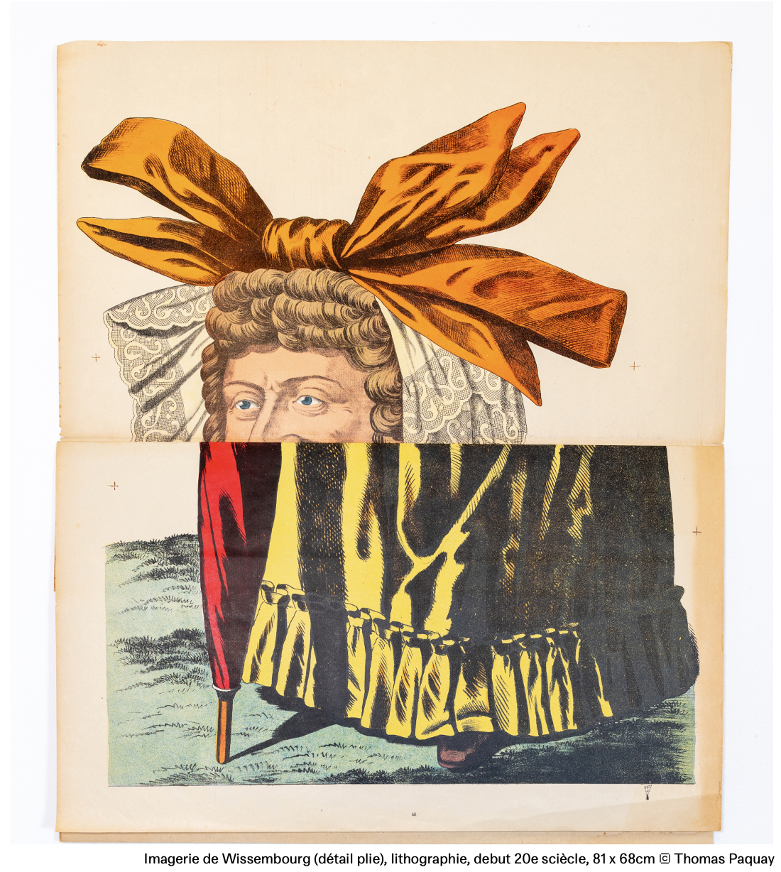 Son travail est nourri d'une incessante recherche d'imprimés de toutes sortes, qui forment aujourd'hui une impressionnante collection d'un art qu'on dit "modeste", depuis les cahiers d'enfants jusqu'aux artefacts de la culture populaire. Ici, il laisse libre à cours à son obsession pour un type tout particulier d'images : une série de lithographies représentant différentes figures humaines grandeur nature, réalisées par l'imprimerie Wentzel à Wissembourg entre la fin du 19e et le début du 20e siècle. Archétypes singuliers, représentant·e·s d'un groupe social ou d'une fonction, elles parviennent jusqu'à nous aujourd'hui dans toute leur désuétude. À travers les couleurs éclatantes et l'absurdité des postures, résonne leur humanité. Cette humanité précaire, on la retrouve dans les marionnettes liégeoises que Benjamin Monti met en dialogue avec ces images. Rustres, elles touchent par leur humilité, leur simplicité économe.