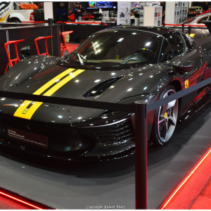 L’impressionnante exposition “75 Years Formula 1”, en collaboration avec Officina Caira, a réuni cette année des bolides F1 légendaires — des premières voitures de Grand Prix aux chefs-d’œuvre technologiques modernes qui dominent les circuits actuels. Dans un autre hall on a pu découvrir une F1 qui fut pilotée par Alain Prost. Je fus bien étonné par le prix de vente d'une Mercedes 300 SL Gullwing rouge : 1.495.000 €!!!