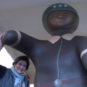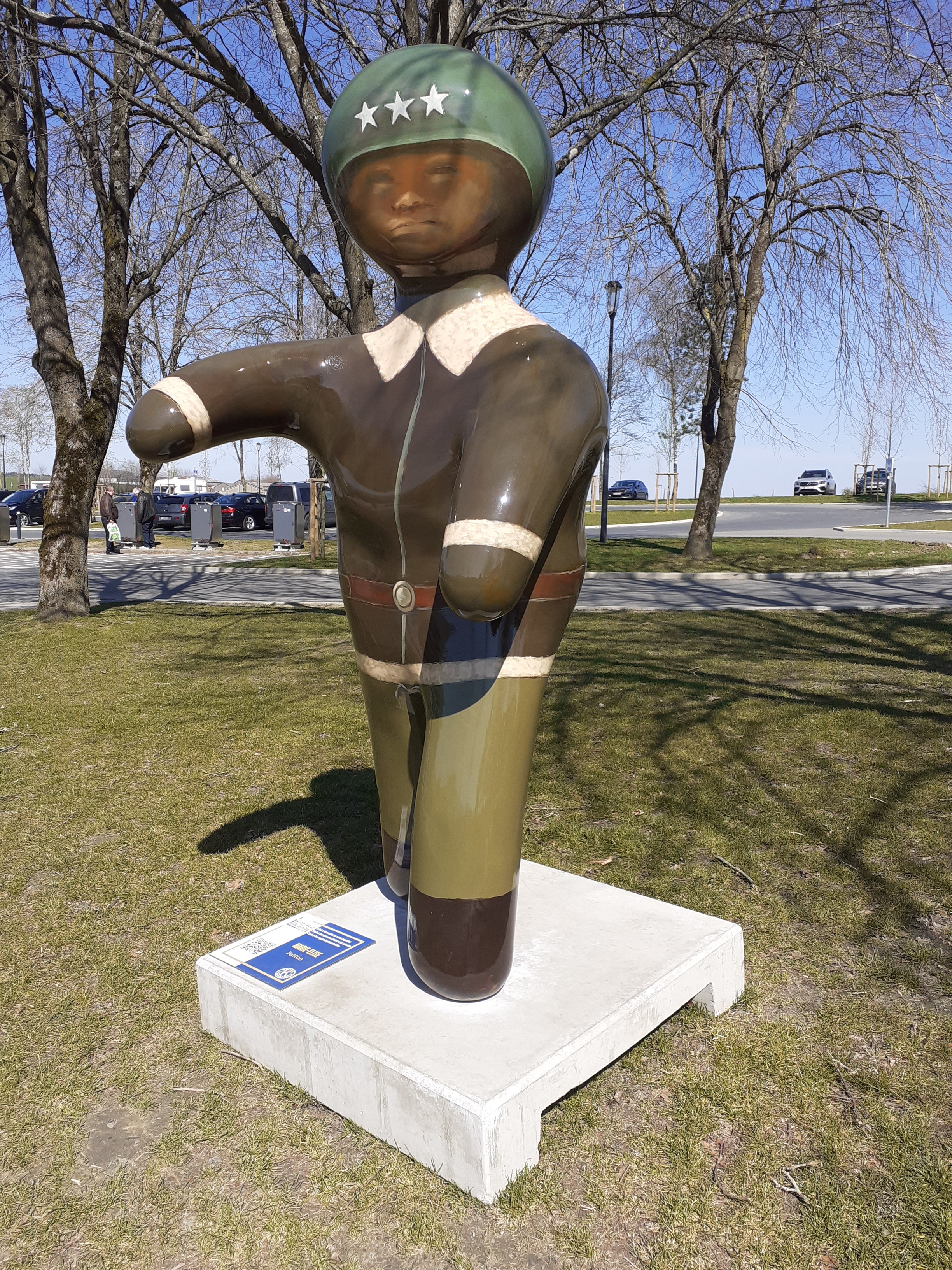 Marie-Elise décore pour le Kiwanis une poupée géante de Patton que l'on pourra découvrir dans les rues de Bastogne à partir du 1er avril 2021.