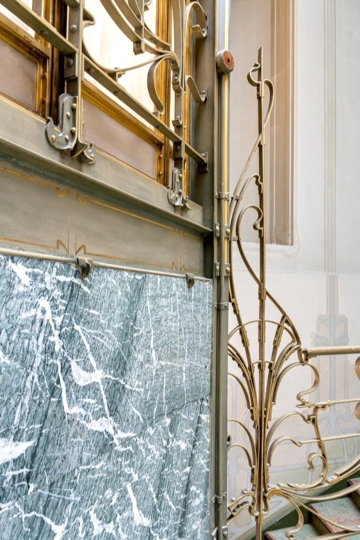 À l’intérieur de l’hôtel, Victor Horta a utilisé des matériaux provenant du Congo et certains motifs évoquent l’ancienne colonie. Dans l’entrée, deux portes vitrées s’ouvrent sur un escalier de mosaïque qui accueille les visiteurs et les emmène de l’ombre du hall à la lumière du bel étage.