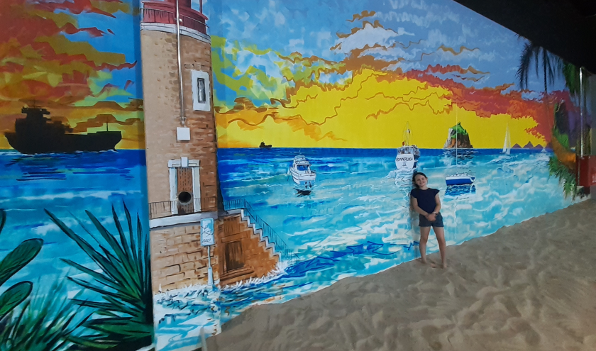 Sous la surveillance des parents visitant le centre commercial, les enfants jouent sur la plage de Pommerloch au Luxembourg devant une fresque monumentale réalisée par Jean-Marie Lesage. L'entrée est gratuite.