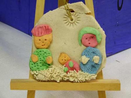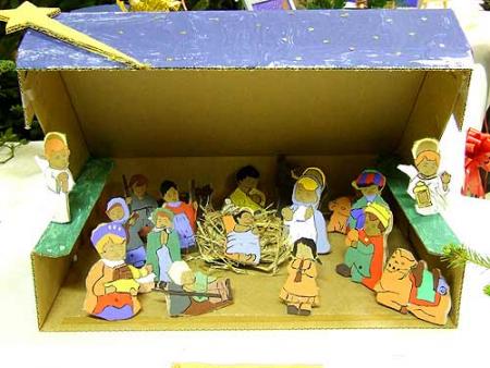 Exposition dans la salle du patronage à Nadrin de crèches réalisées par les habitants .