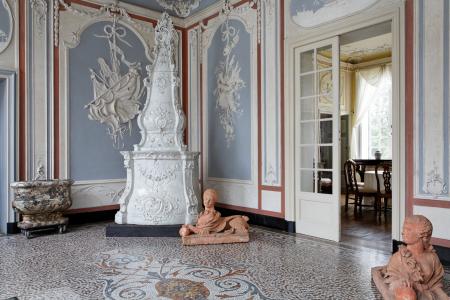 Décoré de stucs d’une facture particulièrement raffinée symbolisant l’eau, le feu, la terre et l’aire, le hall d’entrée donne le ton de la demeure. Un grand salon s’étend sur toute la largeur du bâtiment. Sa belle cheminée en marbre est surmontée d’un miroir orné de guirlandes et d’instruments de musique et de colombes. Du grand salon, on accède au ravissant petit salon Louis XVI. Des médaillons où jouent des amours s’y détachent en blanc sur le fond des murs.