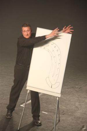 D'emblée, le ton est donné : "j'ai ici une lettre datant de 1262, en Word" (et de montrer la page imprimée)". La lecture de quelques passages, dissertés avec humour, sert en fait d'introduction à ce qui est le corps de son spectacle : "Don Quichotte". Le public ne l'a évidemment pas lu. Mais Yann VDB, si. Et de nous conter l'histoire - dans sa version décalée - , nous servant au passage des "Maïté, c'est comme la Méditerranée en avril, une fois que t'es dedans, elle est bonne !" ou encore "un tapas, 10 francs, 10 tapas, 100 balles".