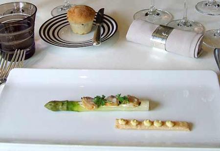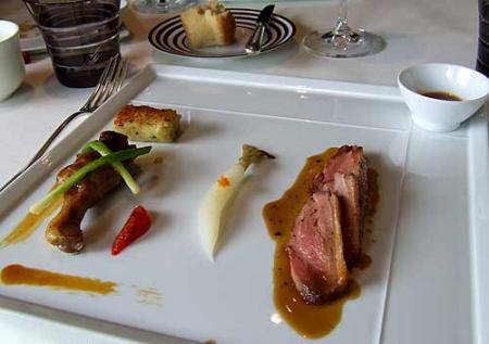Un menu Saveur du Produit emmène le convive au cœur du goût. L’huître Gillardeau (la préférée de Miterrand) s’y acoquine avec le pied de porc, enrobée d’un gel de pomme verte et relevée de crème aigre. Un canard de Bresse livre une interprétation de la ‘destructuration’ chère à cuisine moderne au gré de deux cuissons, deux sauces, deux garnitures. Le menu Composition de Printemps en dégustation compte 6 services – confidence : c’est Tristan Martin qui est le créateur de l’Asperge ‘Robert Blanc’ (du nom de son producteur dans le Vaucluse) qu’accompagne exceptionnellement une palourde en ouverture de festin. Ris de veau et langoustine ou Petit Gris, soupe de pomme de terre et borquin (un saucisson de la région) s’inscrivent dans les alliances terre-mer qui font la personnalité de Lemonnier, tout comme la défense des produits du patrimoine régional et des artisans qui pêchent la dorade sauvage dans des petits bateaux, affinent des fromages magnifiques ou cultivent asperges, artichauts barigoule et pomme de terre ardennaise.