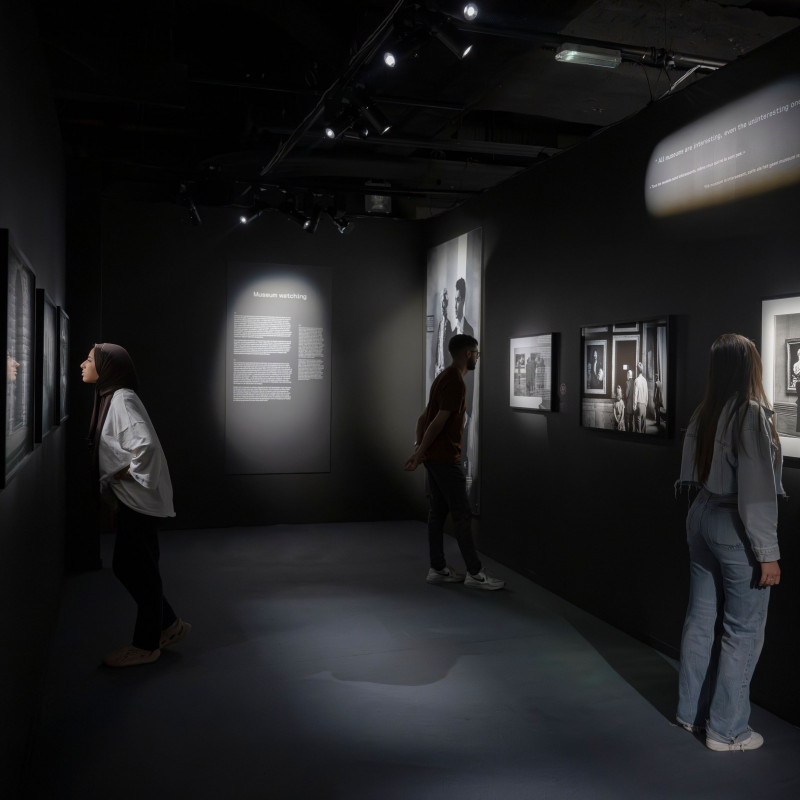 Par ailleurs, nous avons pris le parti d’utiliser les autoportraits d’Elliott Erwitt. Chaque section est introduite par l'un d'eux, le plus souvent en relation avec le sujet traité et toujours dans l’esprit facétieux qui est la marque de fabrique de l’artiste. Mis en espace dans les perspectives offertes par le lieu, ces autoportraits en ligne de mire orientent le regard des visiteurs. L'espace de la Grand Place offre une ambiance intimiste, où au fil de la déambulation,se découvrent les multiples facettes de l'artiste. Les créations audiovisuelles présentées en début et milieu de parcours viennent introduire la personnalité d'Elliott Erwitt, et dévoiler plus précisément son travail de photographe.
