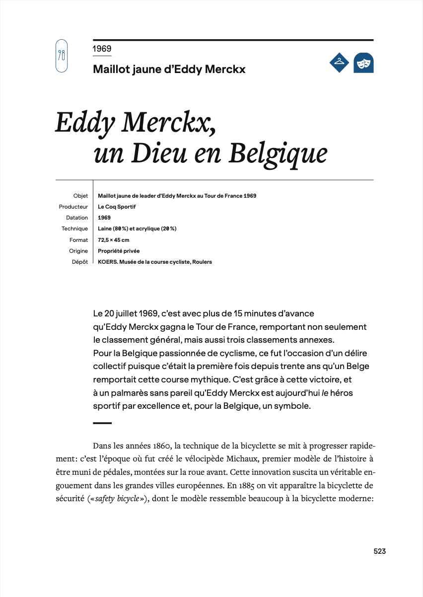 Du biface en silex de Kesselt jusqu'à un symbole de notre culture brassicole, en passant par un gobelet romain, des figurines médiévales en plomb représentant des chevaliers ou le maillot jaune d'Eddy Merckx, c'est la vie de tous les jours qui se raconte ainsi, d'objet en objet. Une épée carolingienne, un insigne avec les trois couleurs nationales et un fouet colonial sont autant de témoins silencieux d'une époque mouvementée.