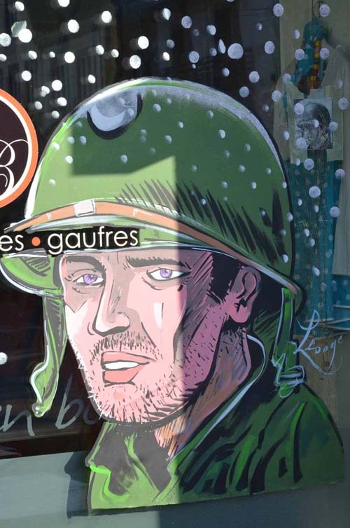 - Houffalize. Exemple de photo d'une peinture sur vitrine à l'occasion du 75 eme anniversaire de la batailles des ardennes avec le tracé sur fond blanc puis la mise en couleur. .