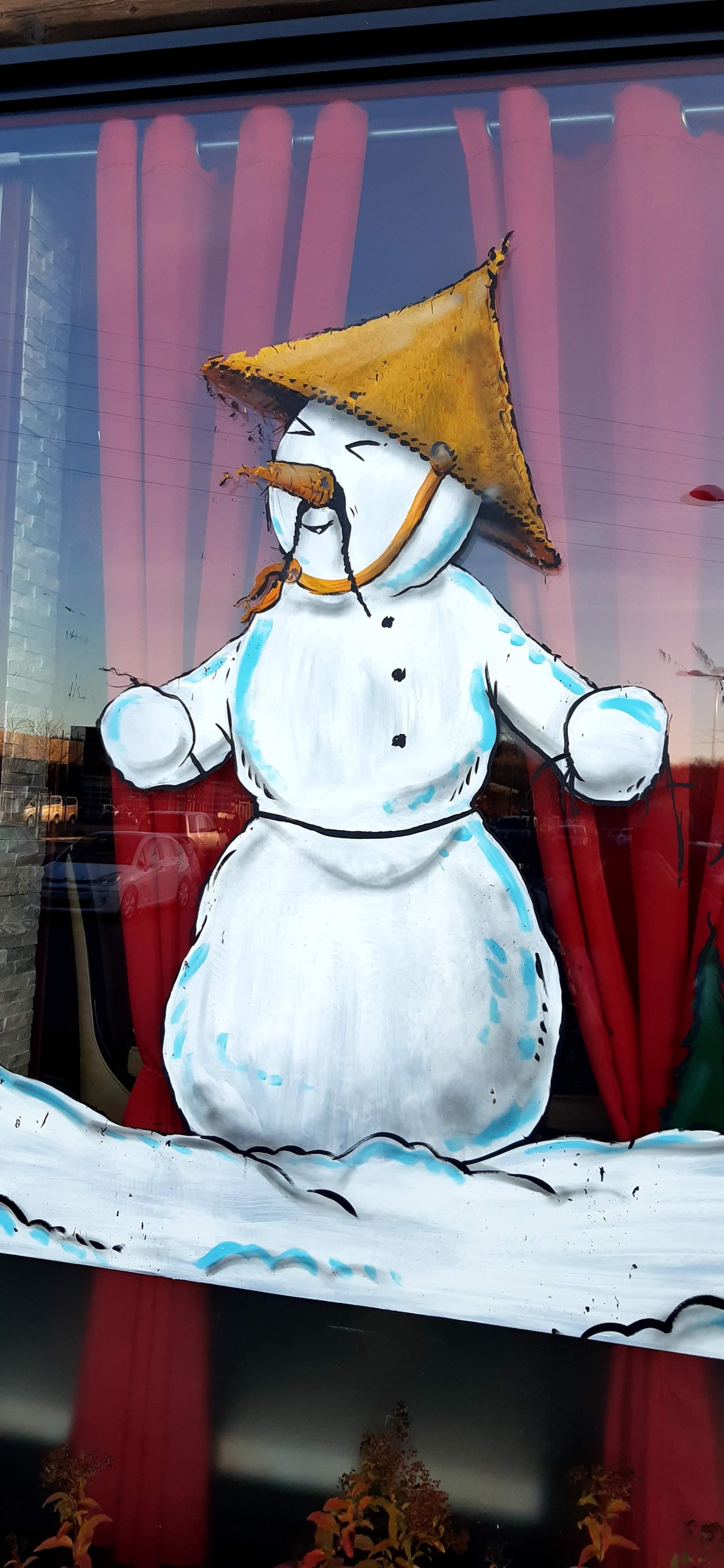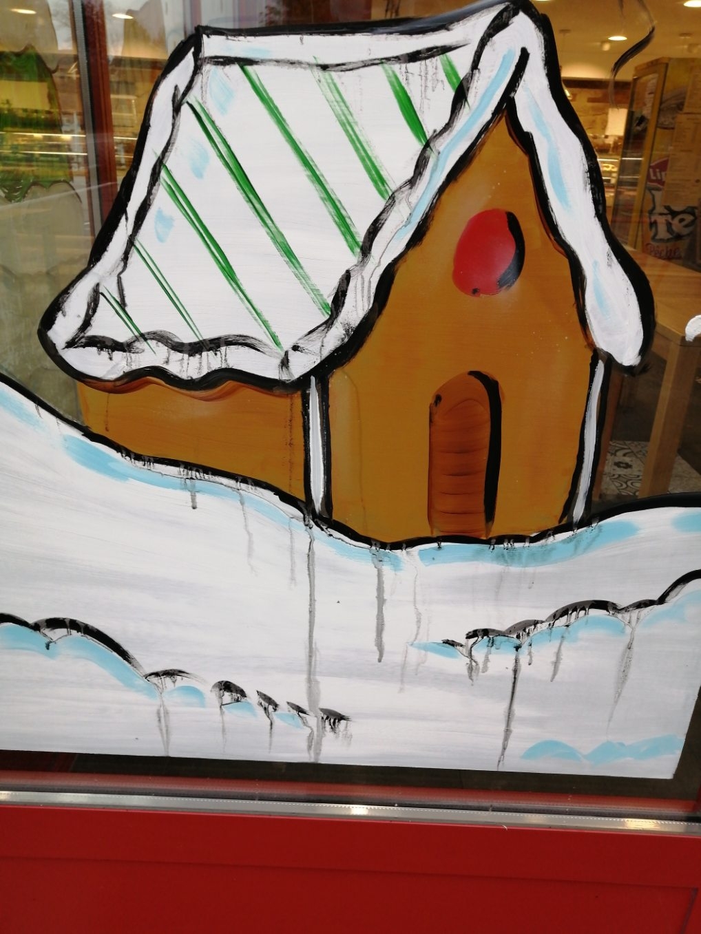 La peinture sur la vitrine est bien faite, lorsque le Soir, la lumière de l'intérieur éclaire la réalisation sans voir les coups de pinceau.